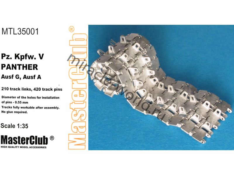 Дополнение для сборных моделей, наборные рабочие металлические траки для немецких средних танков: Sd.Kfz.171 Pz.Kpfw.V Ausf.A "Panther" / Sd.Kfz.171 Pz.Kpfw.V Ausf.G "Panther" в масштабе 1/35 от фирмы Master Club (артикул MTL35001).