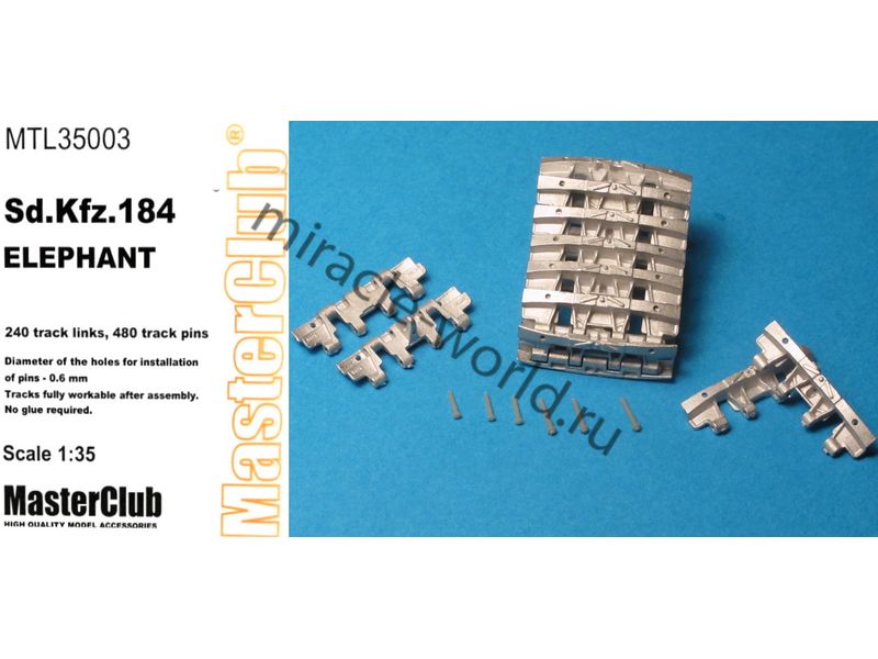 Дополнение для сборных моделей, наборные рабочие металлические траки для немецких тяжелых САУ: Sd.Kfz.184 "Elefant" в масштабе 1/35 от фирмы Master Club (артикул MTL35002).