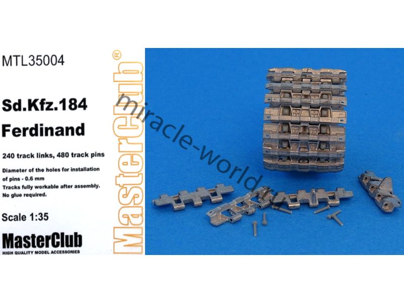 Дополнение для сборных моделей, наборные рабочие металлические траки для немецких тяжелых САУ: Sd.Kfz.184 "Ferdinand" в масштабе 1/35 от фирмы Master Club (артикул MTL35004).
