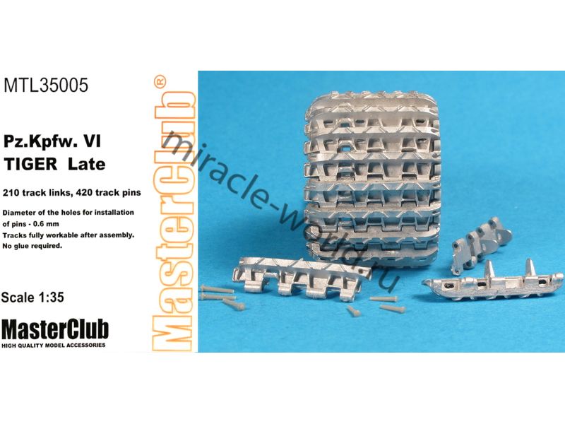 Дополнение для сборных моделей, наборные рабочие металлические траки для немецких тяжелых танков: Sd.Kfz.181 Pz.Kpfw.VI "Tiger I" (поздние) в масштабе 1/35 от фирмы Master Club (артикул MTL35005).