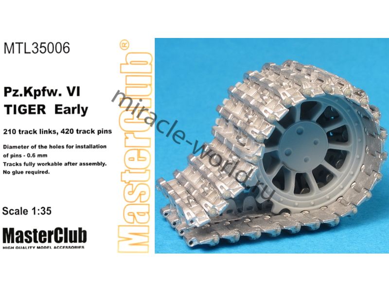 Дополнение для сборных моделей, наборные рабочие металлические траки для немецких тяжелых танков: Sd.Kfz.181 Pz.Kpfw.VI "Tiger I" (ранние) в масштабе 1/35 от фирмы Master Club (артикул MTL35006).