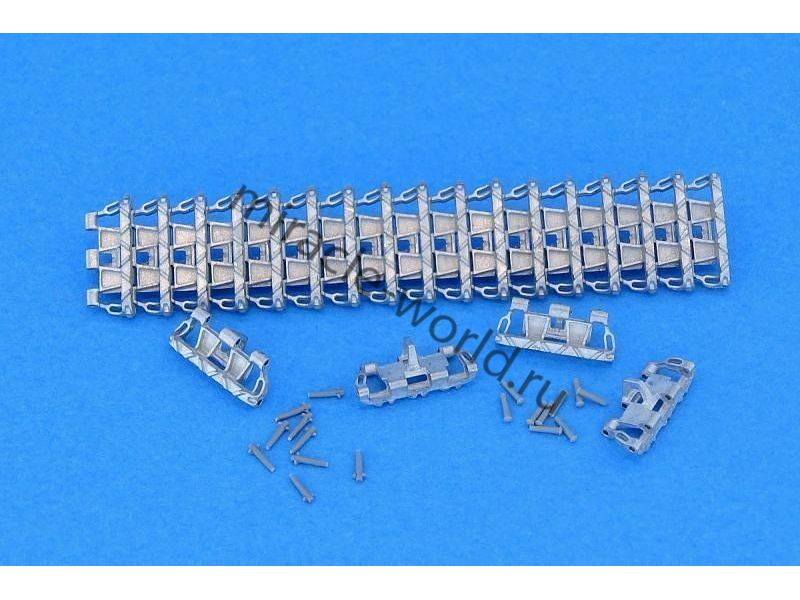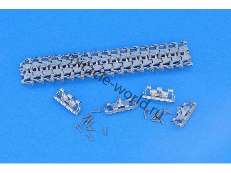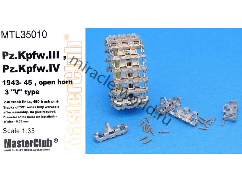 Дополнение для сборных моделей, наборные рабочие металлические траки для немецких средних танков и штурмовых орудий: Sd.Kfz.141 Pz.Kpfw.III, Sd.Kfz.161 Pz.Kpfw.IV, Sd.Kfz.142 StuG III (1943-1945) 3 "V" Type, Open-horn в масштабе 1/35 от фирмы Master Club (артикул MTL35010).