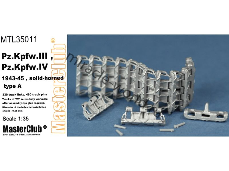 Дополнение для сборных моделей, наборные рабочие металлические траки для немецких средних танков и штурмовых орудий: Sd.Kfz.141 Pz.Kpfw.III, Sd.Kfz.161 Pz.Kpfw.IV, Sd.Kfz.142 StuG III (1943-1945) Solid-horned Type A в масштабе 1/35 от фирмы Master Club (артикул MTL35011).