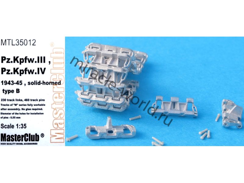 Дополнение для сборных моделей, наборные рабочие металлические траки для немецких средних танков и штурмовых орудий: Sd.Kfz.141 Pz.Kpfw.III, Sd.Kfz.161 Pz.Kpfw.IV, Sd.Kfz.142 StuG III (1943-1945) Solid-horned Type B в масштабе 1/35 от фирмы Master Club (артикул MTL35012).