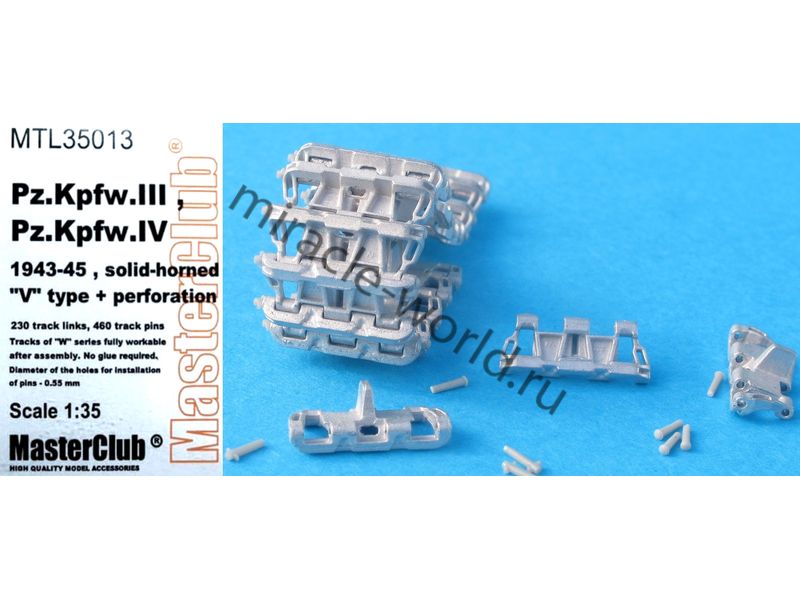 Дополнение для сборных моделей, наборные рабочие металлические траки для немецких средних танков и штурмовых орудий: Sd.Kfz.141 Pz.Kpfw.III, Sd.Kfz.161 Pz.Kpfw.IV, Sd.Kfz.142 StuG III (1943-1945) Solid-horned Type V с перфорацией в масштабе 1/35 от фирмы Master Club (артикул MTL35013).