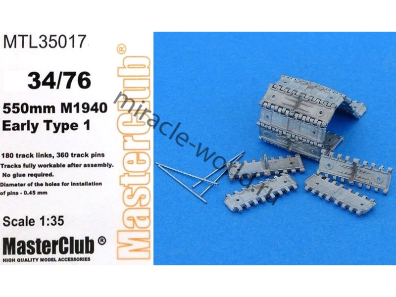 Дополнение для сборных моделей, наборные рабочие металлические траки для средних танков: Танк тип 34/76 (1940, 550-мм, ранний тип 1) в масштабе 1/35 от фирмы Master Club (артикул MTL35017).