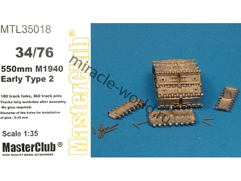 Дополнение для сборных моделей, наборные рабочие металлические траки для средних танков: Танк тип 34/76 (1940, 550-мм, ранний тип 2)) в масштабе 1/35 от фирмы Master Club (артикул MTL35018).