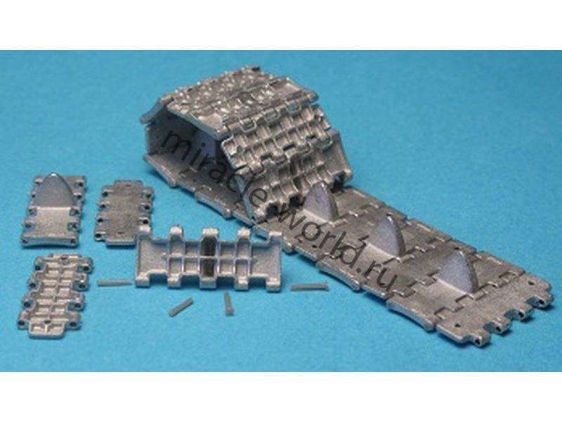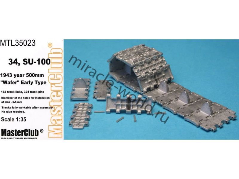Дополнение для сборных моделей, наборные рабочие металлические траки для средних танков и САУ: Танк тип 34/76, Танк тип 34/85, СУ-100 (1943, "вафельные", ранние) в масштабе 1/35 от фирмы Master Club (артикул MTL35023).
