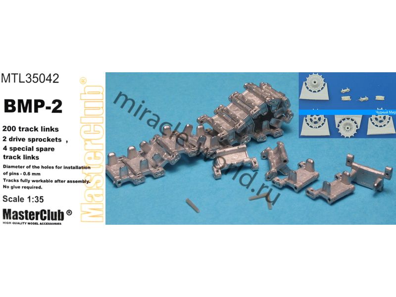 Дополнение для сборных моделей, наборные рабочие металлические траки и ведущие звездочки (смола) для советских / российских боевых машин пехоты: БМП-2 в масштабе 1/35 от фирмы Master Club (артикул MTL35042).