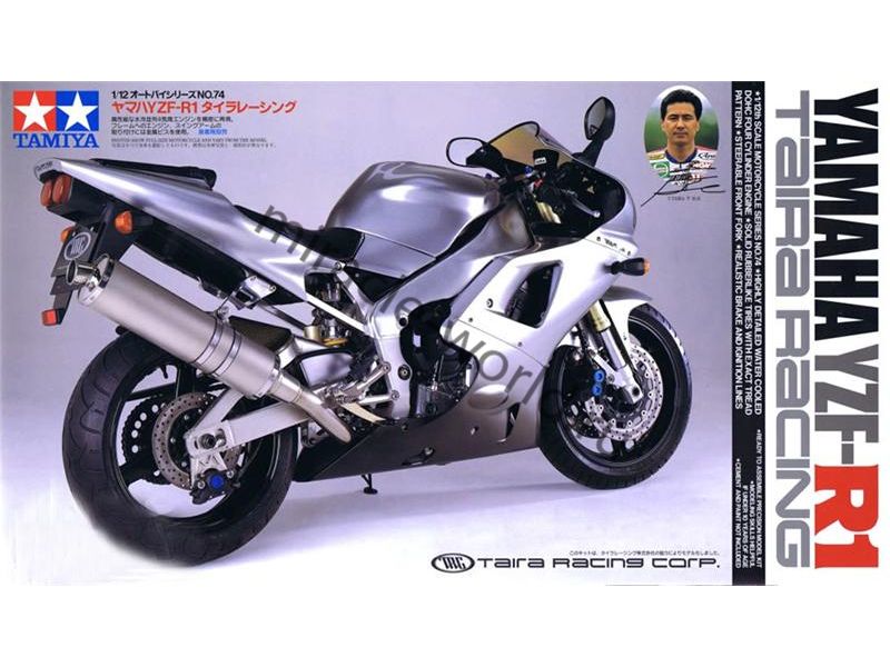 Сборная модель японского спортивного мотоцикла Yamaha YZF-R1 "Taira Racing" в масштабе 1/12 от фирмы Tamiya (артикул 14074).