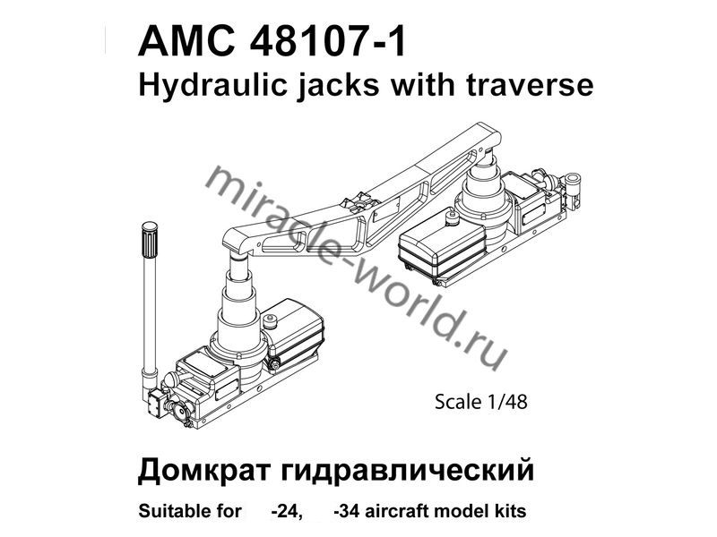 Дополнение для сборных моделей советской / российской авиации (ВКС) Гидравлический домкрат (10 тонн.) с траверсой для снятия колес стоек шасси Самолет (С) тип 24 (в комплекте два домкрата и траверса) в масштабе 1/48 от фирмы Advanced Modeling (артикул 48107-1).