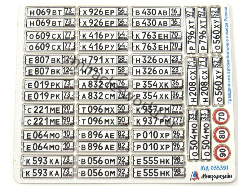МД 035391 Набор гражданских автомобильных номеров современной России выполненных в объеме и цвете. Масштаб 1:35. Набор комплектуется 25 вариантами автомобильных номеров разных регионов Российской Федерации. Набор выполнен по новой уникальной технологии.