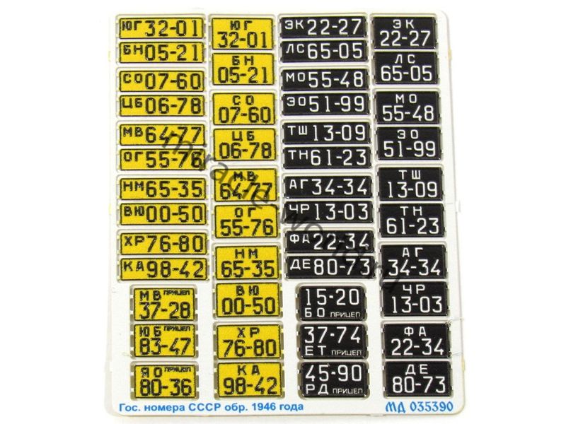 МД 035390 Набор автомобильных военных и гражданских номеров СССР образца 1946 года выполненных в объеме и цвете. Масштаб 1:35. Набор комплектуется 20 вариантами автомобильных номеров и 6 вариантами номеров на прицепы. Набор выполнен по новой уникальной технологии.