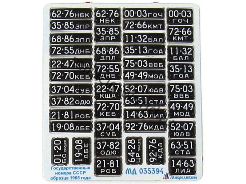 МД 035394 Набор автомобильных военных и гражданских номеров СССР образца 1965 года выполненных в объеме и цвете. Масштаб 1:35. Набор комплектуется 20 вариантами автомобильных номеров и 6 вариантами номеров на прицепы. Набор выполнен по новой уникальной технологии.