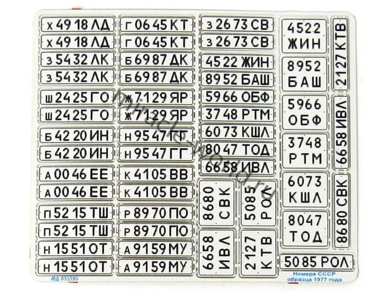 МД 035395 Набор автомобильных военных и гражданских номеров СССР образца 1977 года выполненных в объеме и цвете. Масштаб 1:35. Набор комплектуется 25 вариантами автомобильных номеров. Набор выполнен по новой уникальной технологии.