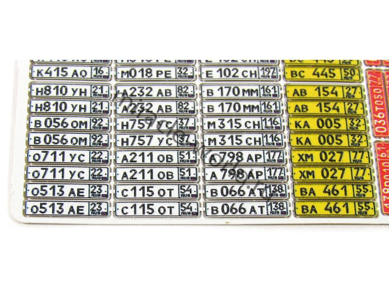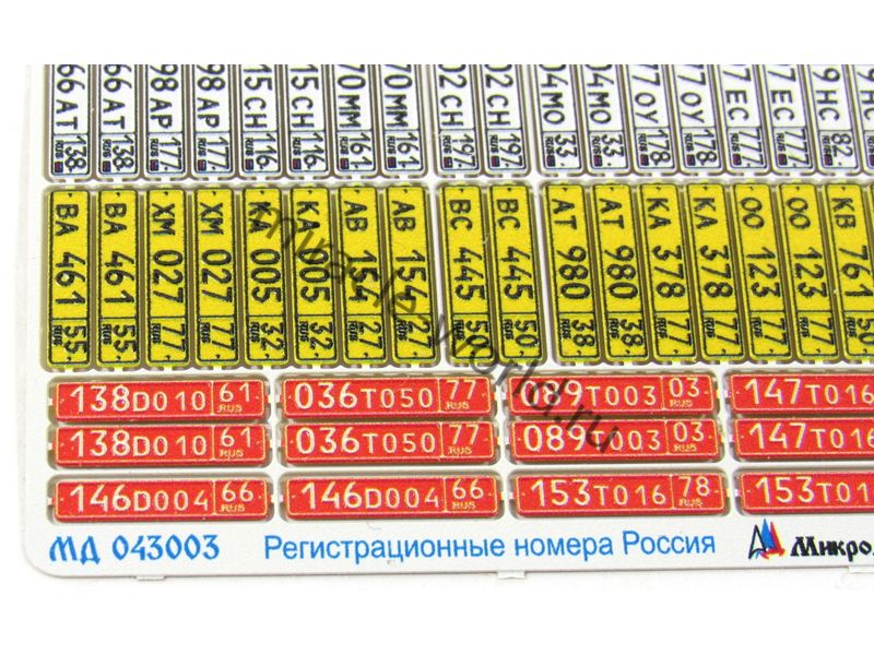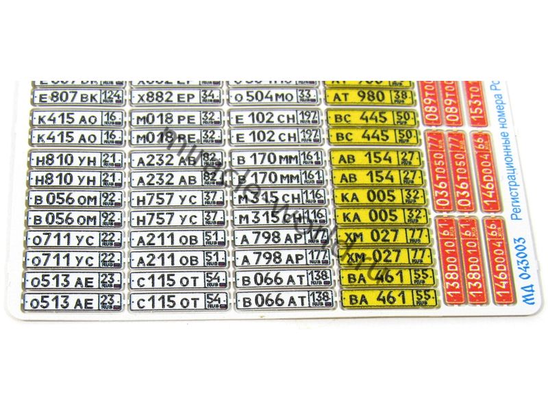 МД 043003 Набор гражданских автомобильных номеров современной России выполненных в объеме и цвете. Масштаб 1:43. Набор комплектуется 35 вариантами автомобильных номеров разных регионов Российской Федерации, транзитными и дипломатическими номерами. Набор выполнен по новой уникальной технологии.