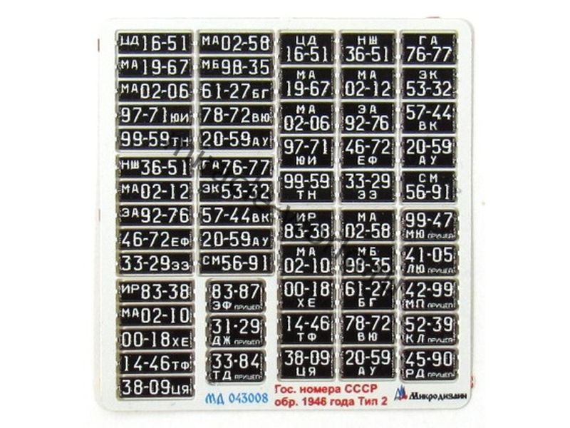 МД 043008 Набор гражданских автомобильных номеров СССР образца 1946 года (тип 2) выполненных в объеме и цвете. Масштаб 1:43. Набор комплектуется 20 вариантом автомобильных номеров разных областей Советского Союза. Набор выполнен по новой уникальной технологии.