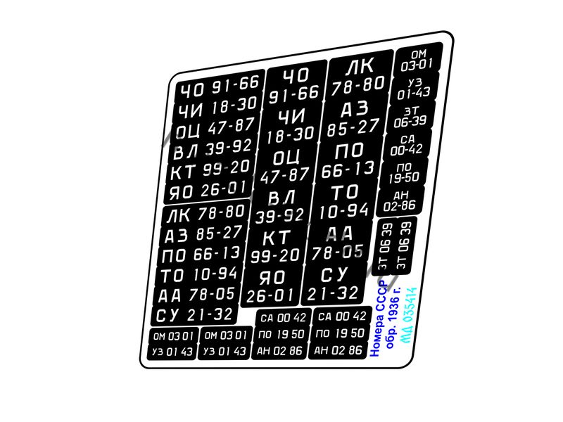 МД 035414 Набор автомобильных государственных номеров СССР образца 1936 года выполненных в объеме и цвете. Масштаб 1:35. Набор комплектуется 15 вариантами автомобильных номеров. Набор выполнен по новой уникальной технологии.