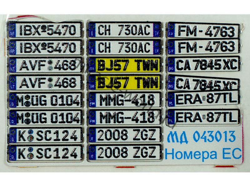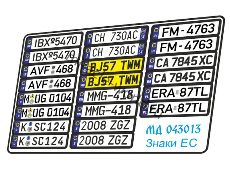 МД 043013 Набор цветного фототравления автомобильных знаков Евросоюза. Масштаб 1:43. Материал: латунь 0,15 мм. Набор комплектуется платой цветного фототравления. Количество комплектов косударственных знаков: 11 пар. Уровень сложности - начальный.