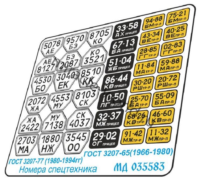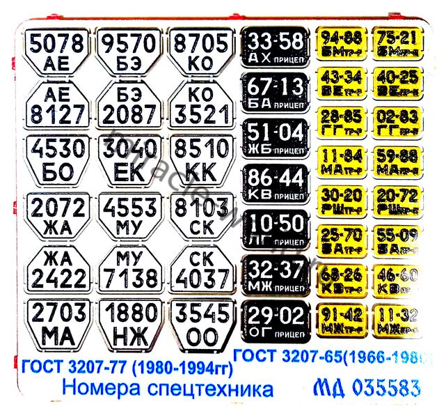 Микродизайн 035583 Набор цветных номеров на трактора и прицепы СССР выполненных в объеме и цвете. Масштаб 1:35. Материал: латунь 0,17 мм. Набор комплектуется 22 вариантами номеров. Уровень сложности: простой