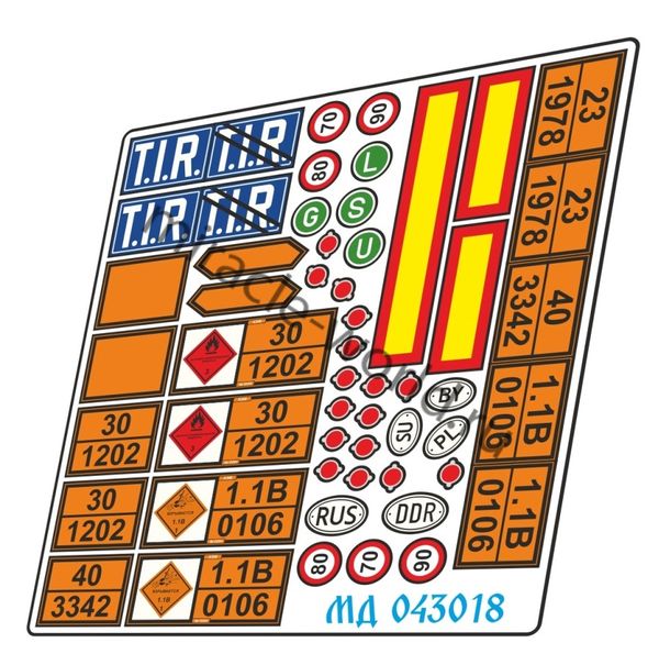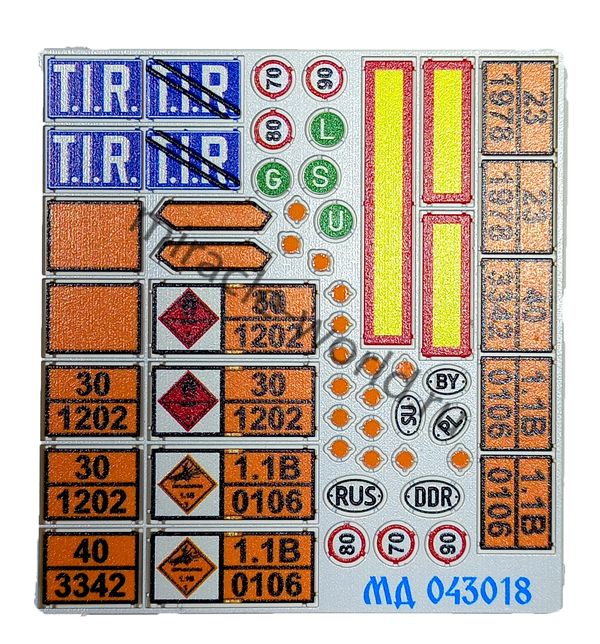 Микродизайн 043018 Набор цветного фототравления цветных опознавательных знаков и знаков опасных грузов для грузовиков. Масштаб 1:43. Материал: латунь 0,2 мм. Количество элементов: 22 шт. . Уровень сложности: