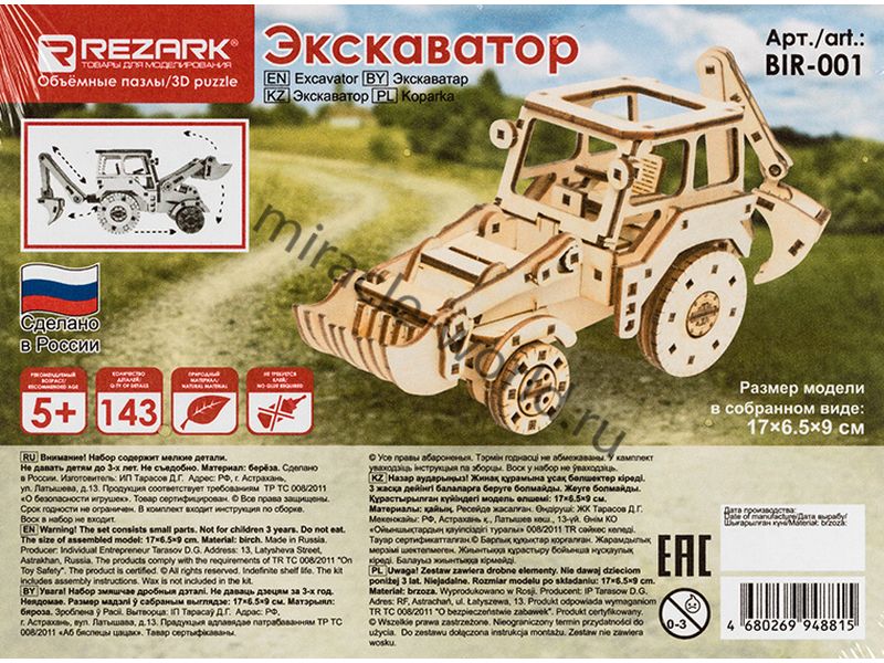 Сборная модель из дерева Пазл 3D "Экскаватор" в масштабе 1/XXX от фирмы REZARK (артикул BIR-001).