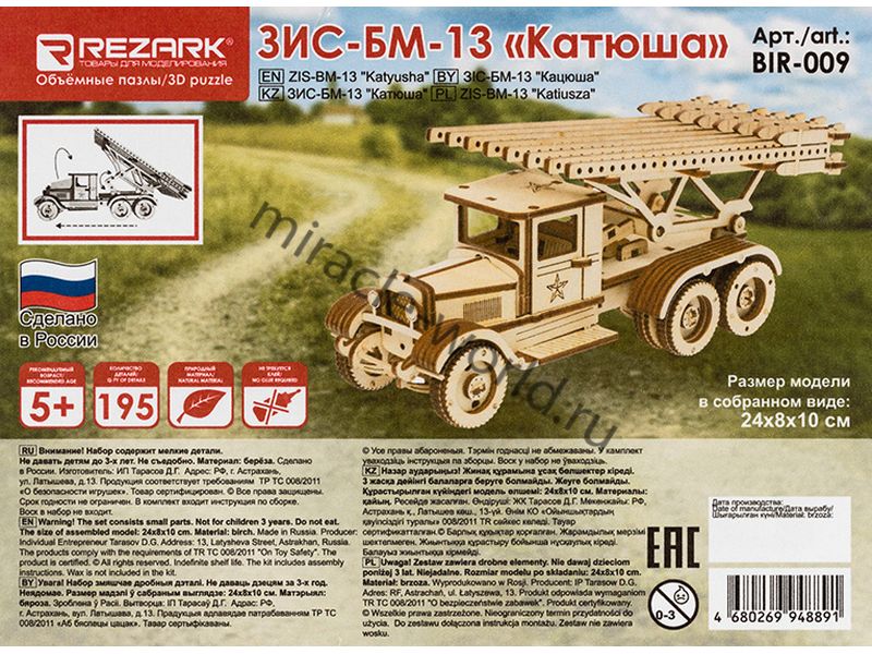 Сборная модель из дерева Пазл 3D "Автомобиль тип БМ-13 Катюша" в масштабе 1/XXX от фирмы REZARK (артикул BIR-009).