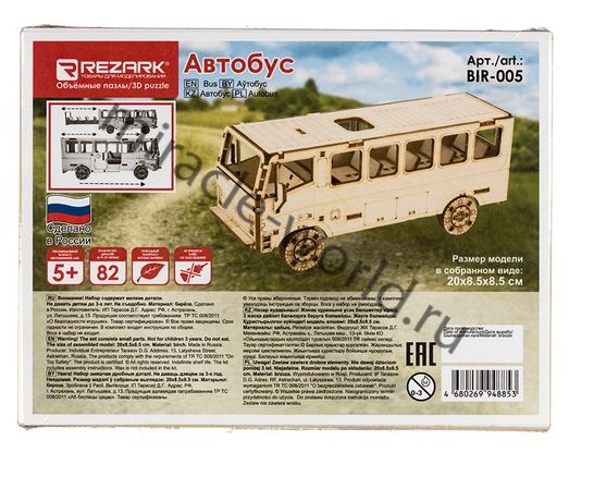 Сборная модель из дерева Пазл 3D "Автобус" в масштабе 1/XXX от фирмы REZARK (артикул BIR-005).
