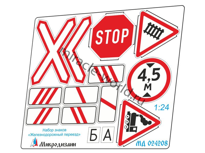 Микродизайн 024208 Набор знаков "Железнодорожный переезд" /цветной набор фототравления/ 1/24