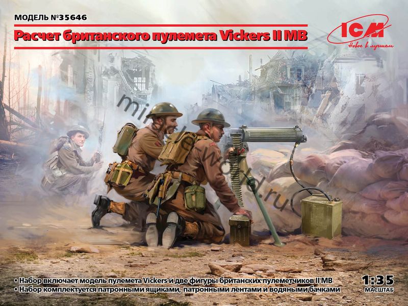 Сборная модель Британский пулеметный расчет с Vickers (WWII) в масштабе 1/35 от фирмы ICM (артикул 35646).