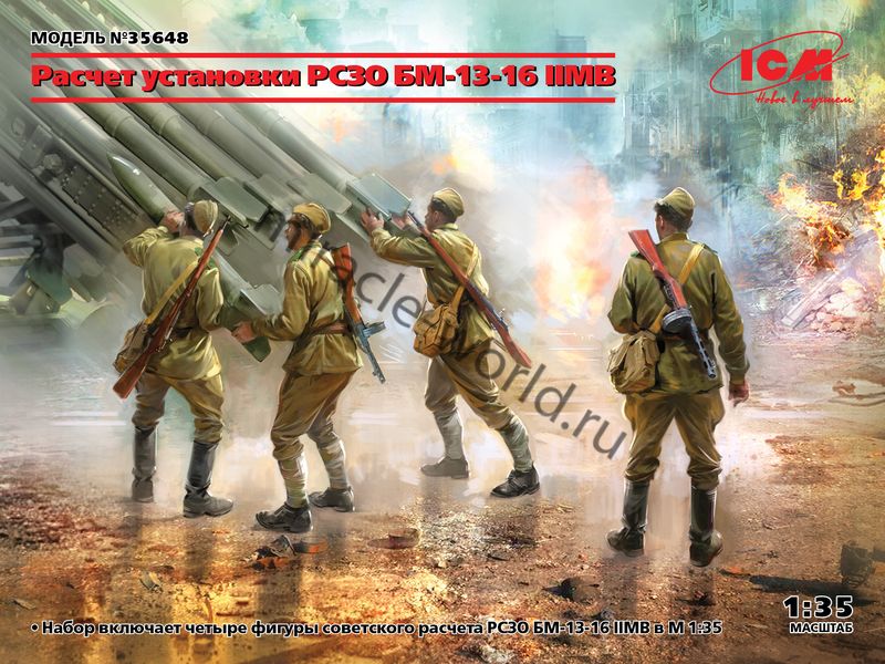 Сборная модель Советский расчет установки РСЗО БМ-13-16 (WWII) в масштабе 1/35 от фирмы ICM (артикул 35648).