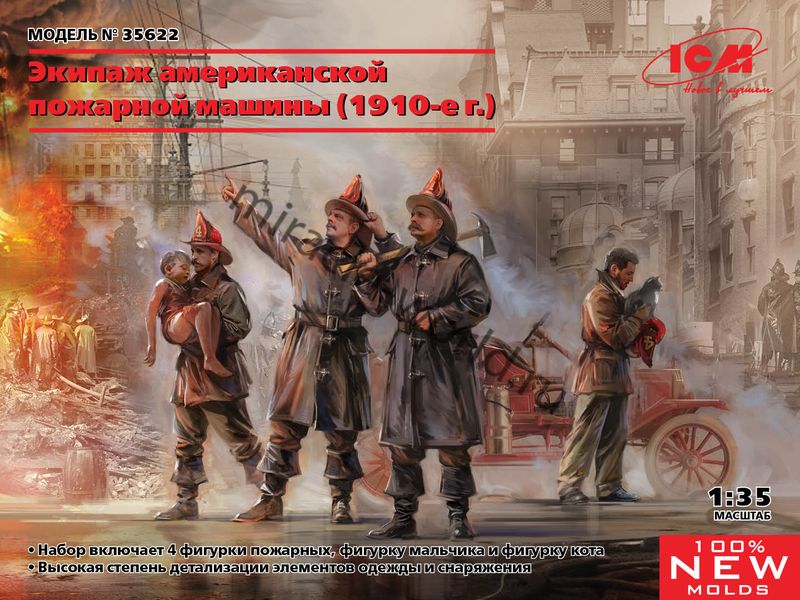 Сборная модель Экипаж американской пожарной машины (1910-е г.) в масштабе 1/35 от фирмы ICM (артикул 35622).