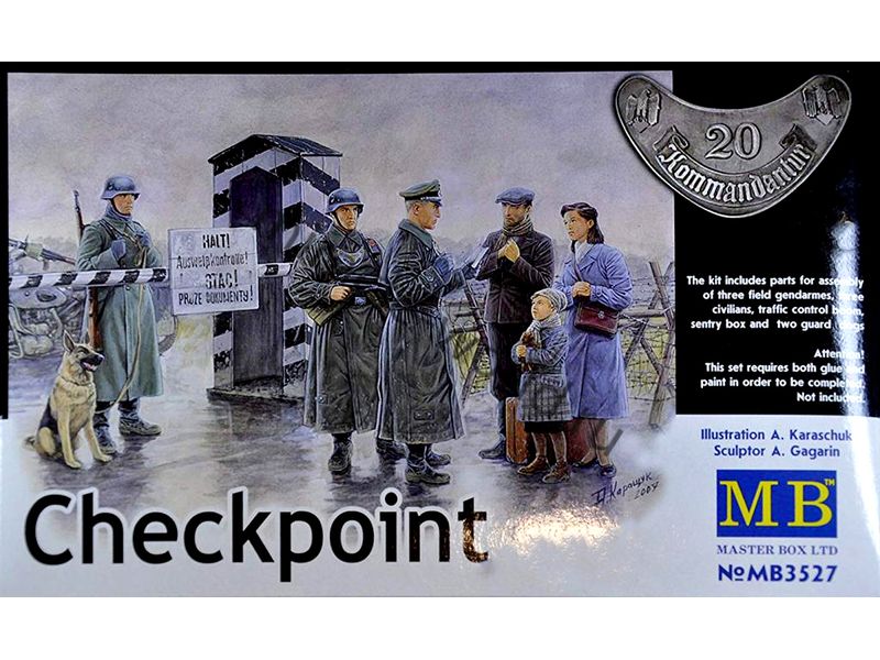 Сборная модель немецкого пропускного пункта с солдатами и гражданскими лицами Немецкий КПП (WWII) в масштабе 1/35 от фирмы Master Box (артикул 3527).