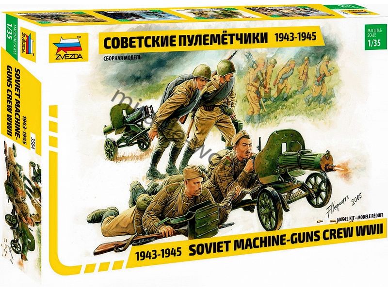Сборная модель миниатюр Советские пулеметчики (2 расчета с пулеметами Максим, WWII) в масштабе 1/35 от фирмы Звезда / Zvezda (артикул 3584).