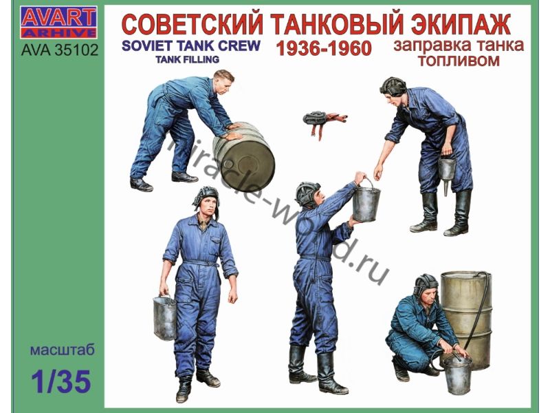 Сборная модель военно-исторической миниатюры Советский танковый экипаж 1936-1960. Заправка танка топливом (5 фигур) в масштабе 1/35 от фирмы Avart Arhive (артикул AVA35102).
