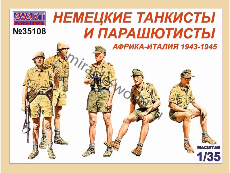 Сборная модель военно-исторической миниатюры Немецкие танкисты и парашютисты (Африка / Италия, 1943-1945) в масштабе 1/35 от фирмы Avart Arhive (артикул AVA35108).