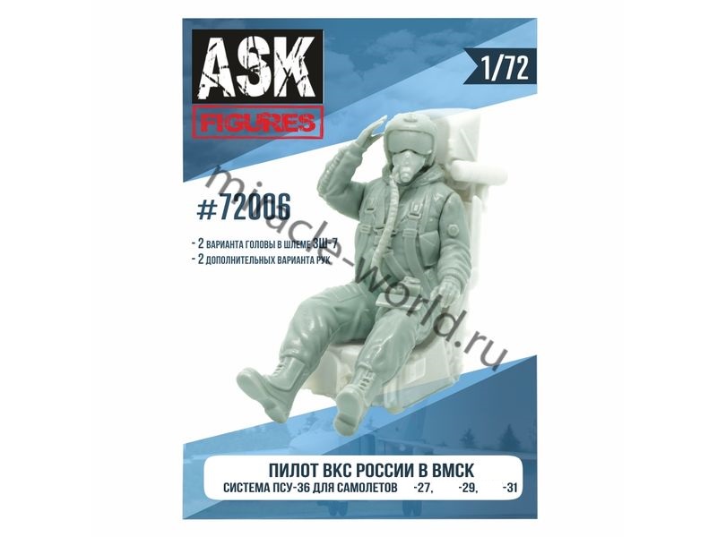 Сборная модель военно-исторической миниатюры Пилот ВКС России в ВМСК, система ПСУ-36 для Самолет (С) тип 27, Самолет (М) тип 29, Самолет (М) тип 31 в масштабе 1/72 от фирмы ASK (артикул 72006).