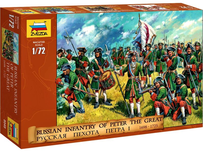 Сборная модель миниатюр Русская пехота Петра I (1698-1725г.) в масштабе 1/72 от фирмы Звезда / Zvezda (артикул 8049).