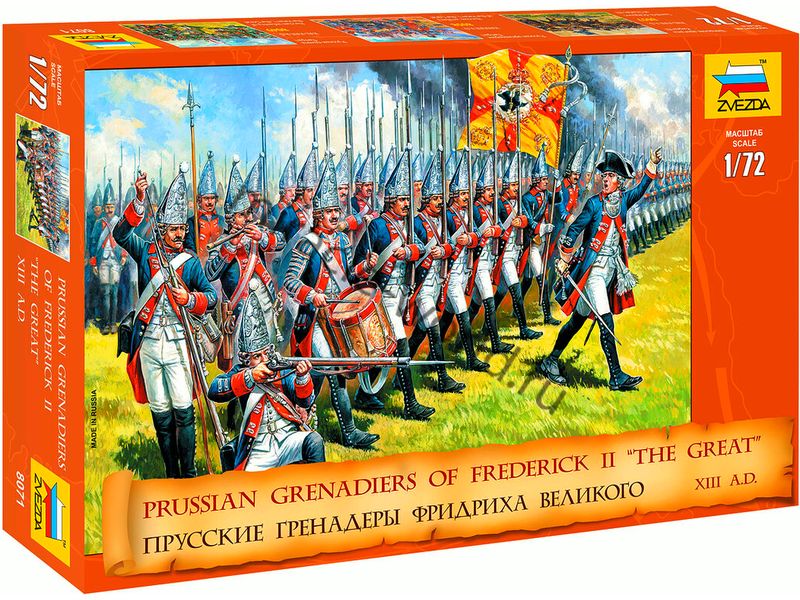 Сборная модель миниатюр Прусские гренадеры Фридриха Великого (XVIII A.D.) в масштабе 1/72 от фирмы Звезда / Zvezda (артикул 8071).