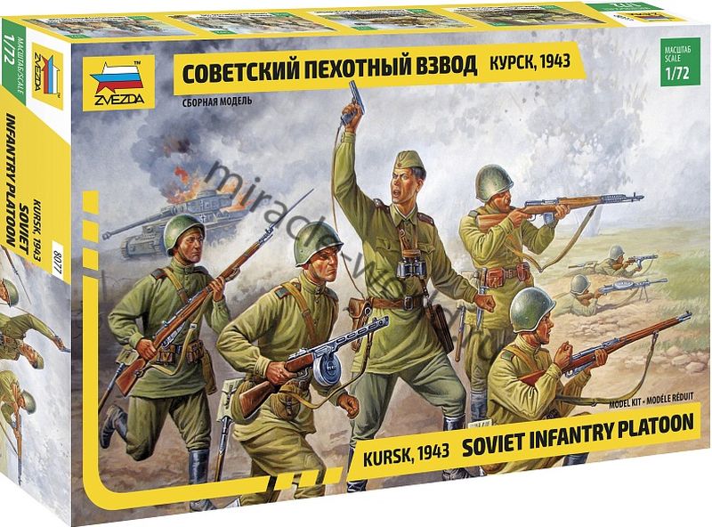 Сборная модель миниатюр Советский пехотный взвод (Курск 1943г.) в масштабе 1/72 от фирмы Звезда / Zvezda (артикул 8077).
