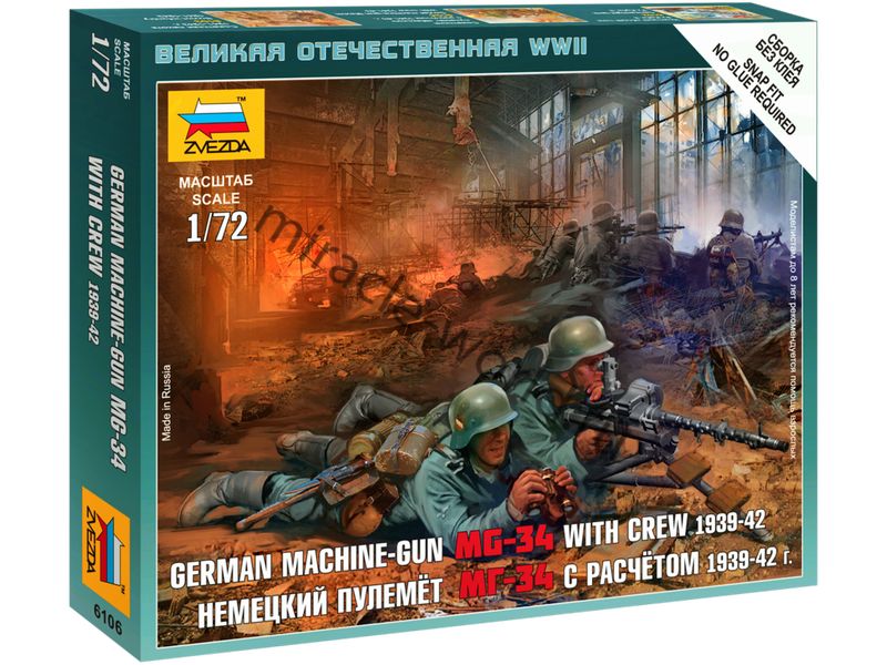 Сборная модель немецкого единого пулемета MG 34 / Maschinengewehr 34 (7,92-мм) с расчетом (1939-1942г.) в масштабе 1/72 от фирмы Звезда / Zvezda (артикул 6106).