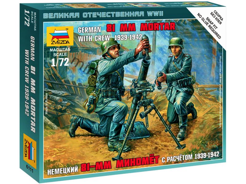 Сборная модель немецкого миномета Granatwerfer 34 / 8 cm GrW 34 (81-мм) выпуска 1942-1943г. с расчетом в масштабе 1/72 от фирмы Звезда / Zvezda (артикул 6111).