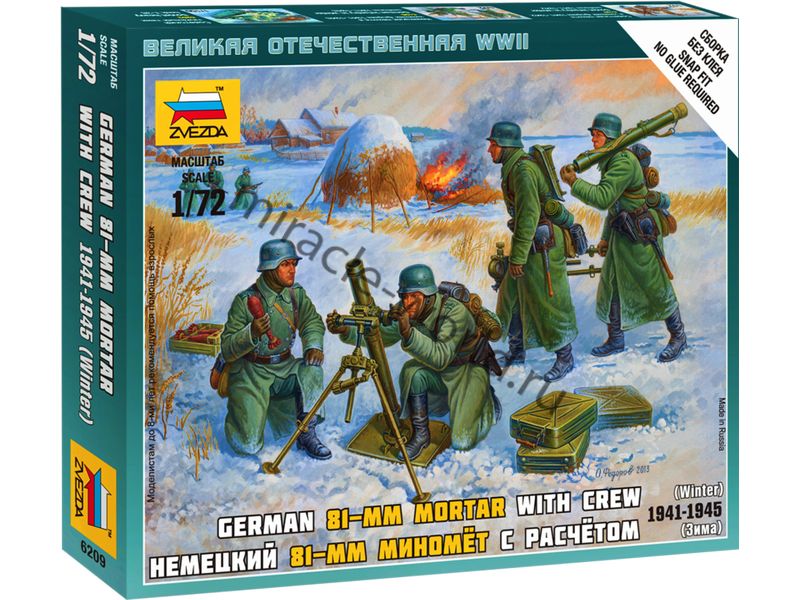 Сборная модель немецкого миномета Granatwerfer 34 / 8 cm GrW 34 (81-мм) с расчетом (зима) в масштабе 1/72 от фирмы Звезда / Zvezda (артикул 6209).