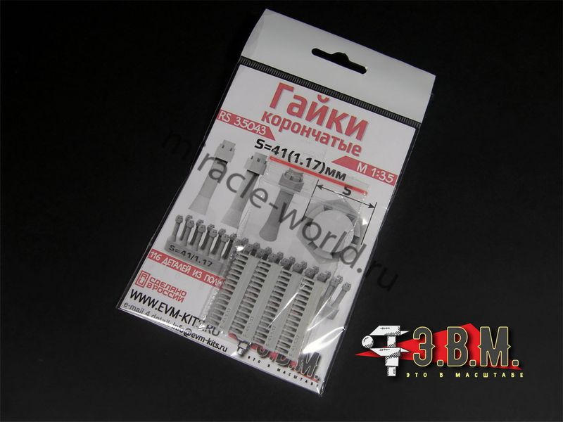 RS35043 Гайки корончатые S=41 (1.17). Масштаб 1/35. Предназначены для повышения деталировки моделей техники в любом масштабе. Материал: полиуретановая смола.