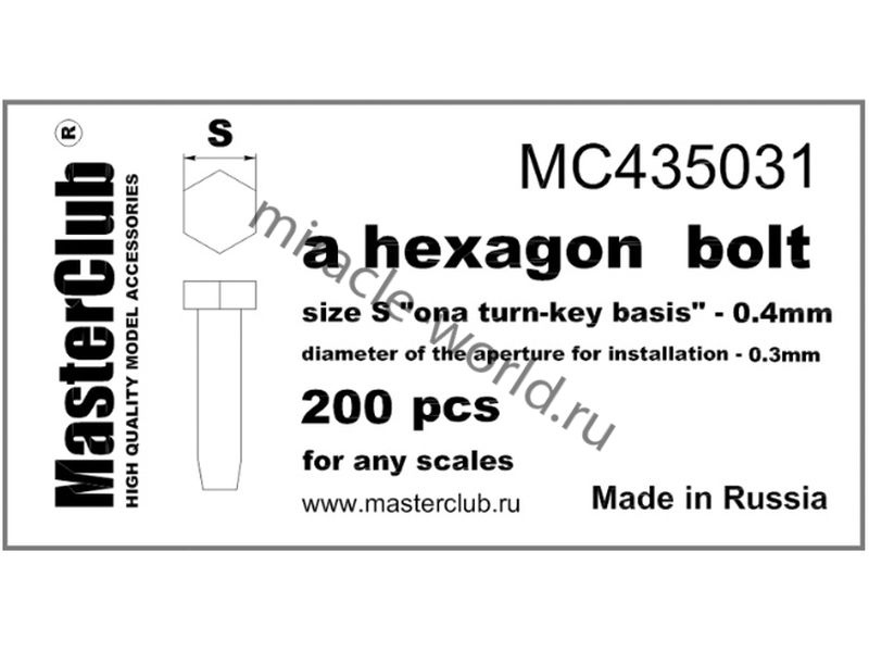 Дополнение для сборных моделей Головка болта, размер под ключ 0,4-мм, диаметр отверстия для монтажа 0,3-мм (в наборе примерно 200шт.) в масштабе 1/35 от фирмы Master Club (артикул MC435031).