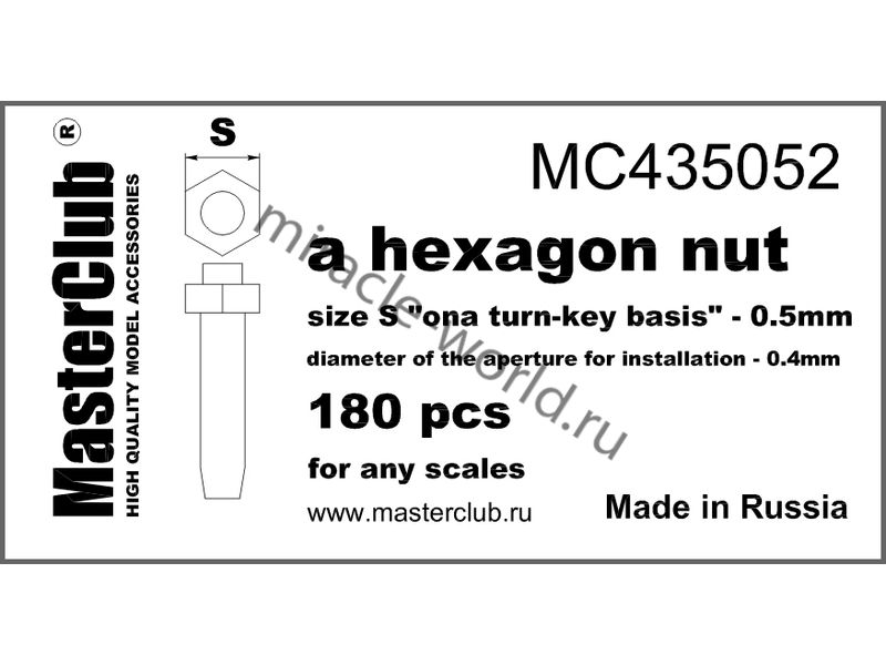 Дополнение для сборных моделей Стандартная гайка, размер под ключ 0,5-мм, диаметр отверстия для монтажа 0,4-мм (в наборе примерно 180шт.) в масштабе 1/35 от фирмы Master Club (артикул MC435052).