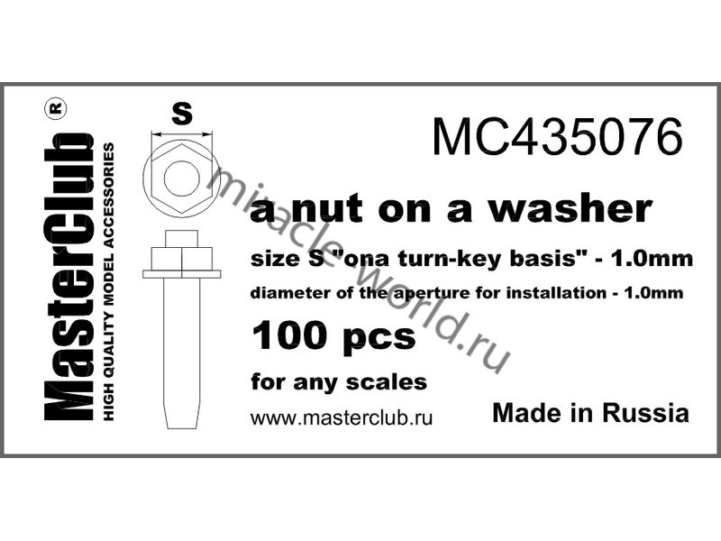 Дополнение для сборных моделей Гайка с шайбой, размер под ключ 1,0-мм, диаметр отверстия для монтажа 1,0-мм (в наборе примерно 100шт.) в масштабе 1/35 от фирмы Master Club (артикул MC435076).