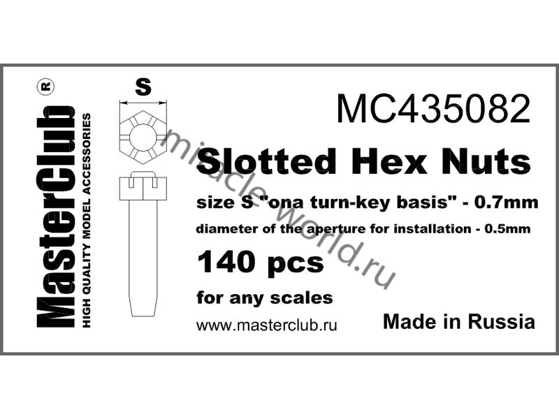 Дополнение для сборных моделей Корончатая гайка, размер под ключ 0,7-мм, диаметр отверстия для монтажа 0,5-мм (в наборе примерно 140шт.) в масштабе 1/35 от фирмы Master Club (артикул MC435082).