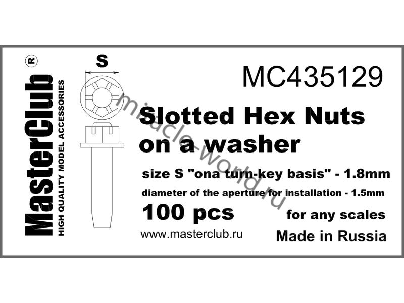 Дополнение для сборных моделей Корончатая гайка с шайбой, размер под ключ 1,8-мм, диаметр отверстия для монтажа 1,5-мм (в наборе примерно 100шт.) в масштабе 1/35 от фирмы Master Club (артикул MC435129).