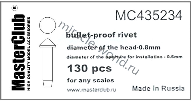 Дополнение для сборных моделей Противопульная головка болта, размер под ключ 0,8-мм, диаметр отверстия для монтажа 0,6-мм (в наборе примерно 130шт.) в масштабе 1/35 от фирмы Master Club (артикул MC435234).